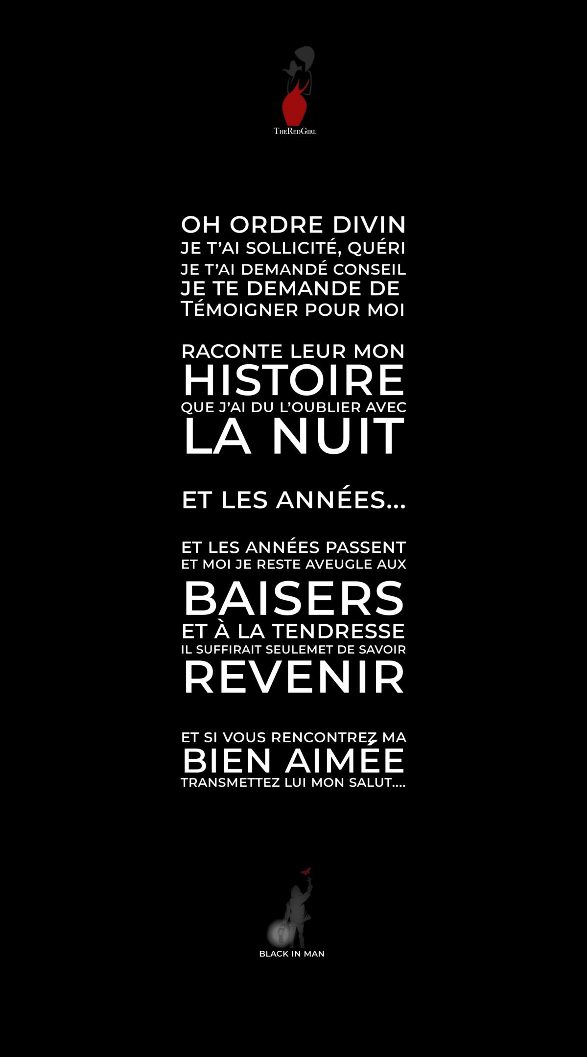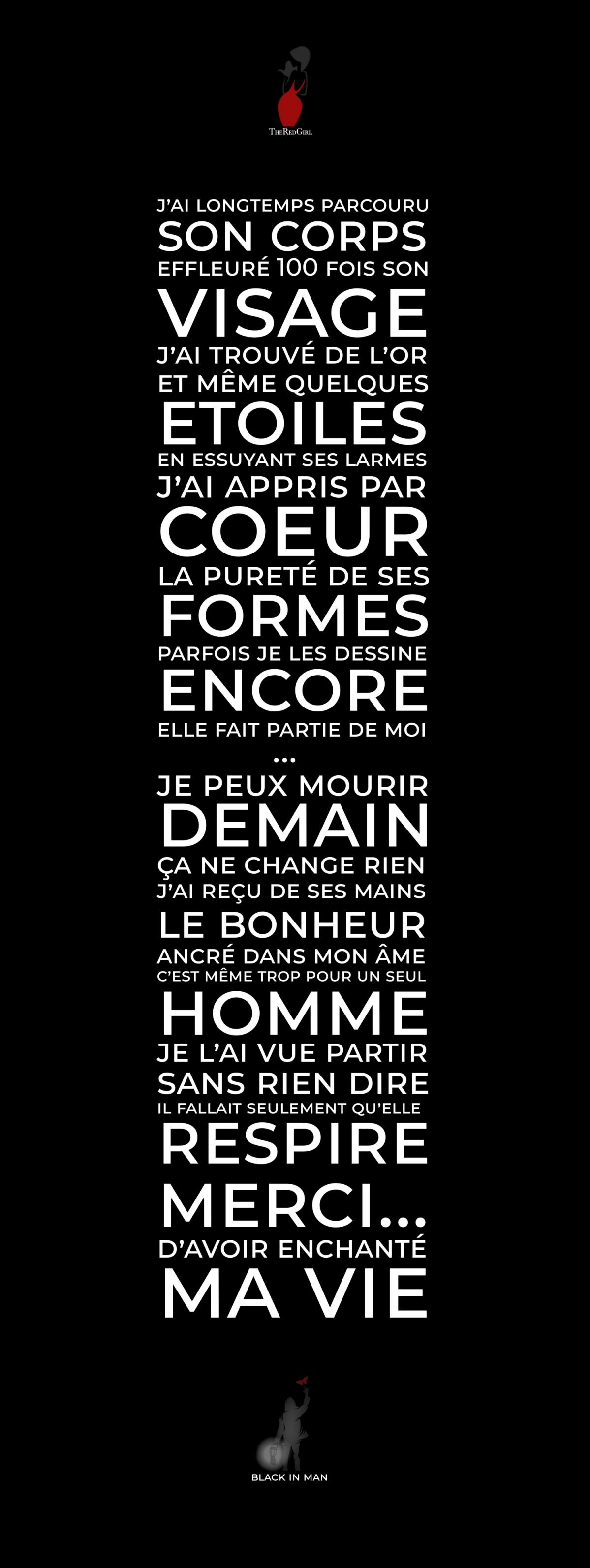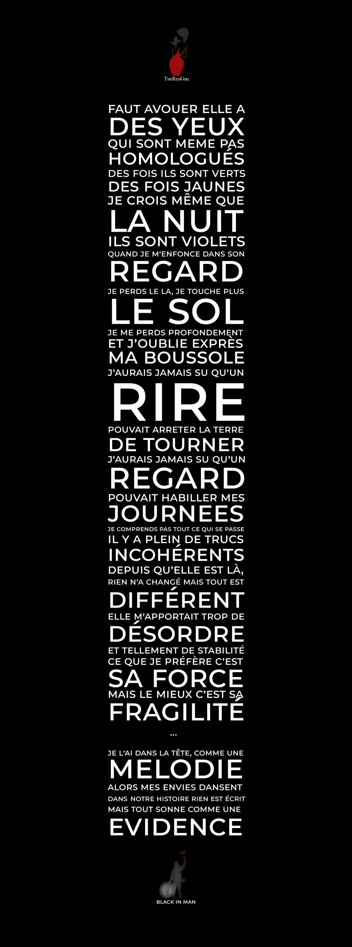 Comme si je me résignais. Non tu n'es pas erreur, ça n'a rien d'un bug, et je ne me résignerais pas. Tu fais partie de mon "meilleur" avenir. Il est trop tard, je t’ai vue, je t’ai entendue, je t’ai regardée, je t’ai écoutée, je t’ai sentie, je t’ai respirée, je t’ai touchée… Tu existes bel et bien, je ne suis pas fou. Seul un fou peut faire comme si tu n’existais pas.