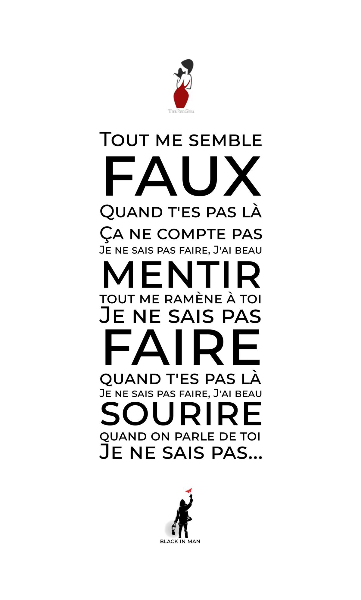 "Ça n'a aucun sens" lol Je suis dans une période de ma vie où tout va bien, où tout me semble facile, je remercie dieu et profite de cette période bénéfique pour me structurer, re-structurer, remettre de l’ordre dans mes affaires, ma vie, ma famille, tout. A l’heure où je suis en train de faire des plans pour mon futur, je m’efforce à le construire… sans toi dedans.